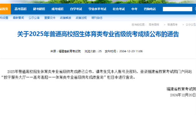 2025年普通高校招生体育类专业省级统考成绩已公布,请考生凭本人账号及密码,登录福建省教育考试院门户网站“数字服务大厅——高考高招——体育类专业省级统考成绩查询”栏目中进行查询。福建省教育考试院2024年12月20日